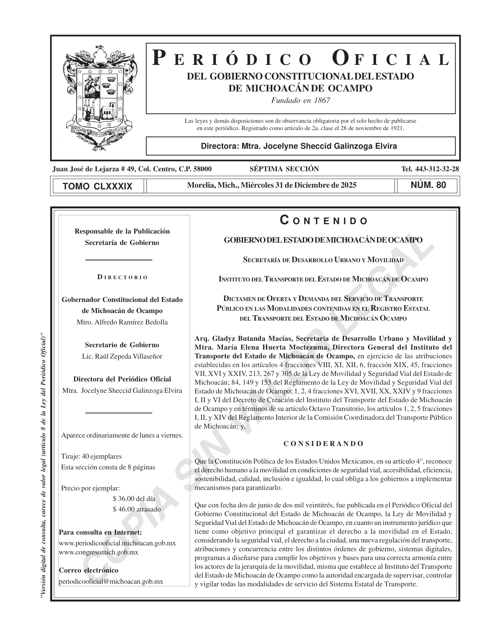 DICTAMEN DE OFERTA Y DEMANDA DEL SERVICIO DE TRANSPORTE PÚBLICO EN LAS MODALIDADES CONTENIDAS EN EL REGISTRO ESTATAL DEL TRANSPORTE DEL ESTADO DE MICHOACÁN OCAMPO