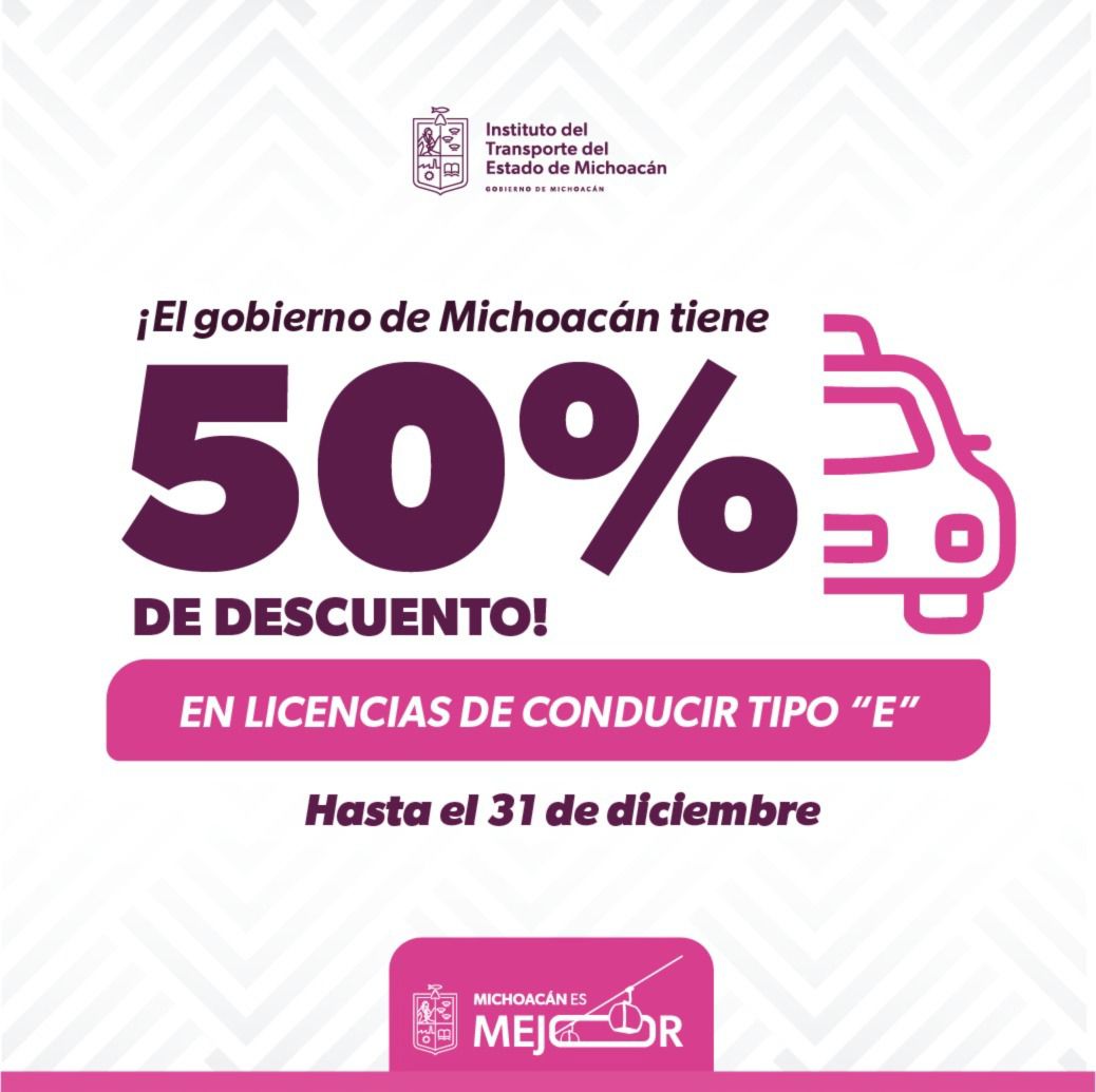 Morelia, Michoacán, 14 de noviembre de 2025.- El Instituto del Transporte de Michoacán (ITransporte) anunció un descuento del 50 por ciento en las licencias de conducir del servicio público. Esta medida, vigente durante lo que resta del año, busca facilitar y agilizar los procesos de regularización para los transportistas del estado.